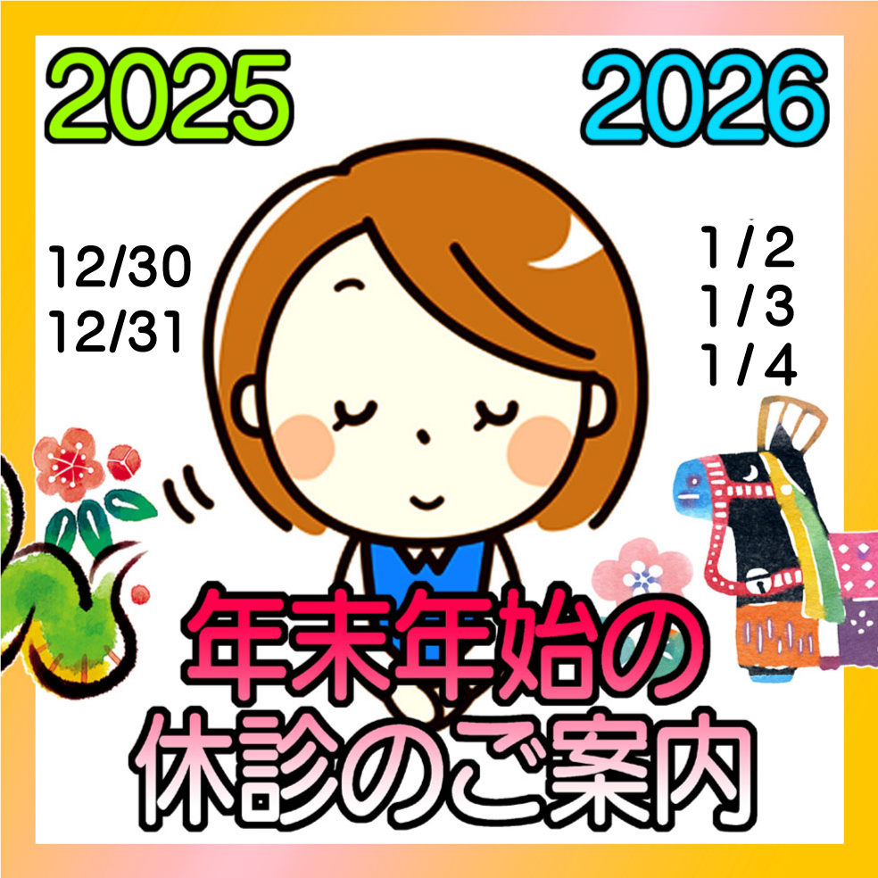 年末年始の休診は下記の通りです。12月30日(火)休診、12月31日(水)休診、1月1日(木)当番医、1月2日(金)~1月4日(日)休診